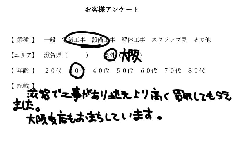 買取実績・買取エリア 電線やピカ銅の買取実績【電気設備業者・大阪エリア】 お客様の声 |電線買取専門ピカR1号線店からのコメント 大阪 電気設備業者 様 被覆電線スクラップをお持込み頂きありがとうございます。 他店・他県に負けないようにしっかりとした値付けを迅速にウェブサイト含め設定したいと思います。 大阪支店につきましては、当社でも検討しておりますので、その際はよろしくお願いします。 大阪までお帰りの際はお気を付けください。 担当 島本 電話をかける 買取価格一覧はコチラ 2020.08.29 買取価格一覧 本日の電線や銅スクラップの買取価格一覧になります。ご予約・事前連絡等は不要で、年中無休で営業しております。電線80%・電線70%・電線60… アクセスマップはコチラ 2020.09.07 アクセスマップ 電線買取専門ピカR1号線店へのアクセスはコチラ。〒528-0212 滋賀県甲賀市土山町南土山720…… お問合せはコチラ 2020.09.07 お問合せフォーム 滋賀県全域対応の電線買取専門ピカR1号線店へのお問合せフォームはコチラ。お電話によるお問合せも…… 出張買取はコチラ 2021.09.24 出張買取について お問合せフォーム、電話、LINEからご連絡頂き、出張買取の旨をお伝え頂き、お客様情報をお伺い致します。その後、引取り・回収・容器の設置等で… お持込みの流れはコチラ 2021.09.24 お持込みの流れ お問合せフォーム、電話、LINEからご連絡頂き、出張買取の旨をお伝え頂き、お客様情報をお伺い致します。その事前に御予約等は不要です。営業時… トップページ 下記は「金属スクラップ図鑑」から引用しています 環境・SDGs関連の記事はコチラ 3R(スリーアール) リサイクルとは? リユースについて リデュースってなに? 0.SDGsってなに? 1.貧困をなくそう 2.飢餓をゼロに 3.すべての人に健康と福祉を 4.質の高い教育をみんなに 5.ジェンダー平等を実現しよう 6.安全な水とトイレを世界中に 7.エネルギーをみんなに、そしてクリーンに 8.働きがいも経済成長も 9.産業と技術革新の基盤を作ろう 10.人や国の不平等をなくそう 11.住み続けられる街づくりを 12.つくる責任、つかう責任 13.気候変動に具体的な対策を 14.海の豊かさを守ろう 15.陸の豊かさも守ろう 16.平和と公正をすべての人に 17.17のパートナーシップで目標を達成しよう 被覆電線関連 電線スクラップってなに? ナゲット加工 歩留まりとは? 実質歩留まりと計算歩留まり ナゲットの母材の種類 電線スクラップの種類と用途 国内向け電線と輸出向け電線の違いを解説 剥線【線剥き】 電線ドラムのリサイクルシステム 電線の用語を解説-SQ・スケ・スケア 家電線【弱電線】 va線【fケーブル】 家電ハーネス【弱電ハーネス】 ハーネス線【自動車ハーネス】 シュレッダーハーネス アルミ線 鉄線・鋼線 カラー線【単線】 通信線 吊り線【鉄付き線】 50%線【太線】 60%線【65%線】 皮銅【皮付き配管パイプ】 75%線【80%線】 銅帯線 レール銅 鉄管線【鉄巻き線】 クリスマスツリーの線 消磁コイル・テレビ線 ≫偏光ヨークとは? エレベーター線(エレベーターケーブル) LINE 会社案内一覧 トップページ 電線やピカ銅の買取実績【電気工事業者・滋賀エリア】