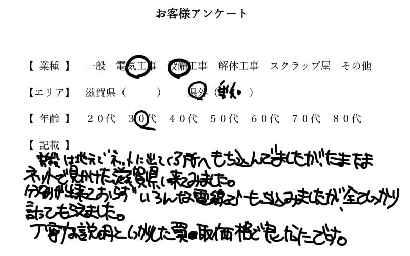 買取実績・買取エリア 電線やピカ銅の買取実績【電気設備工事業者・愛知エリア】 お客様の声 |電線買取専門ピカR1号線店からのコメント 愛知 電気設備業者 様 80%線、70%線、60%線など愛知県からお持込み頂きありがとうございました。 ウェブサイトを見てのお持込みありがとうございました。ぜひ他社様との価格を比べながらご検討頂ければと思います。 弊社では、お客様の方で分別や選別が出来ていない場合であっても、専門スタッフが全てしっかりと計り分けを行い、確実に説明を致します。 また機会がありましたら、ぜひお越しください。 担当 島本 電話をかける 買取価格一覧はコチラ 2020.08.29 買取価格一覧 本日の電線や銅スクラップの買取価格一覧になります。ご予約・事前連絡等は不要で、年中無休で営業しております。電線80%・電線70%・電線60… アクセスマップはコチラ 2020.09.07 アクセスマップ 電線買取専門ピカR1号線店へのアクセスはコチラ。〒528-0212 滋賀県甲賀市土山町南土山720…… お問合せはコチラ 2020.09.07 お問合せフォーム 滋賀県全域対応の電線買取専門ピカR1号線店へのお問合せフォームはコチラ。お電話によるお問合せも…… 出張買取はコチラ 2021.09.24 出張買取について お問合せフォーム、電話、LINEからご連絡頂き、出張買取の旨をお伝え頂き、お客様情報をお伺い致します。その後、引取り・回収・容器の設置等で… お持込みの流れはコチラ 2021.09.24 お持込みの流れ お問合せフォーム、電話、LINEからご連絡頂き、出張買取の旨をお伝え頂き、お客様情報をお伺い致します。その事前に御予約等は不要です。営業時… トップページ 下記は「金属スクラップ図鑑」から引用しています 環境・SDGs関連の記事はコチラ 3R(スリーアール) リサイクルとは? リユースについて リデュースってなに? 0.SDGsってなに? 1.貧困をなくそう 2.飢餓をゼロに 3.すべての人に健康と福祉を 4.質の高い教育をみんなに 5.ジェンダー平等を実現しよう 6.安全な水とトイレを世界中に 7.エネルギーをみんなに、そしてクリーンに 8.働きがいも経済成長も 9.産業と技術革新の基盤を作ろう 10.人や国の不平等をなくそう 11.住み続けられる街づくりを 12.つくる責任、つかう責任 13.気候変動に具体的な対策を 14.海の豊かさを守ろう 15.陸の豊かさも守ろう 16.平和と公正をすべての人に 17.17のパートナーシップで目標を達成しよう 被覆電線関連 電線スクラップってなに? ナゲット加工 歩留まりとは? 実質歩留まりと計算歩留まり ナゲットの母材の種類 電線スクラップの種類と用途 国内向け電線と輸出向け電線の違いを解説 剥線【線剥き】 電線ドラムのリサイクルシステム 電線の用語を解説-SQ・スケ・スケア 家電線【弱電線】 va線【fケーブル】 家電ハーネス【弱電ハーネス】 ハーネス線【自動車ハーネス】 シュレッダーハーネス アルミ線 鉄線・鋼線 カラー線【単線】 通信線 吊り線【鉄付き線】 50%線【太線】 60%線【65%線】 皮銅【皮付き配管パイプ】 75%線【80%線】 銅帯線 レール銅 鉄管線【鉄巻き線】 クリスマスツリーの線 消磁コイル・テレビ線 ≫偏光ヨークとは? エレベーター線(エレベーターケーブル) LINE 会社案内一覧 トップページ 電線やピカ銅の買取実績【一般や個人・滋賀エリア】 電線やピカ銅の買取実績【電気工事業者・大阪エリア】